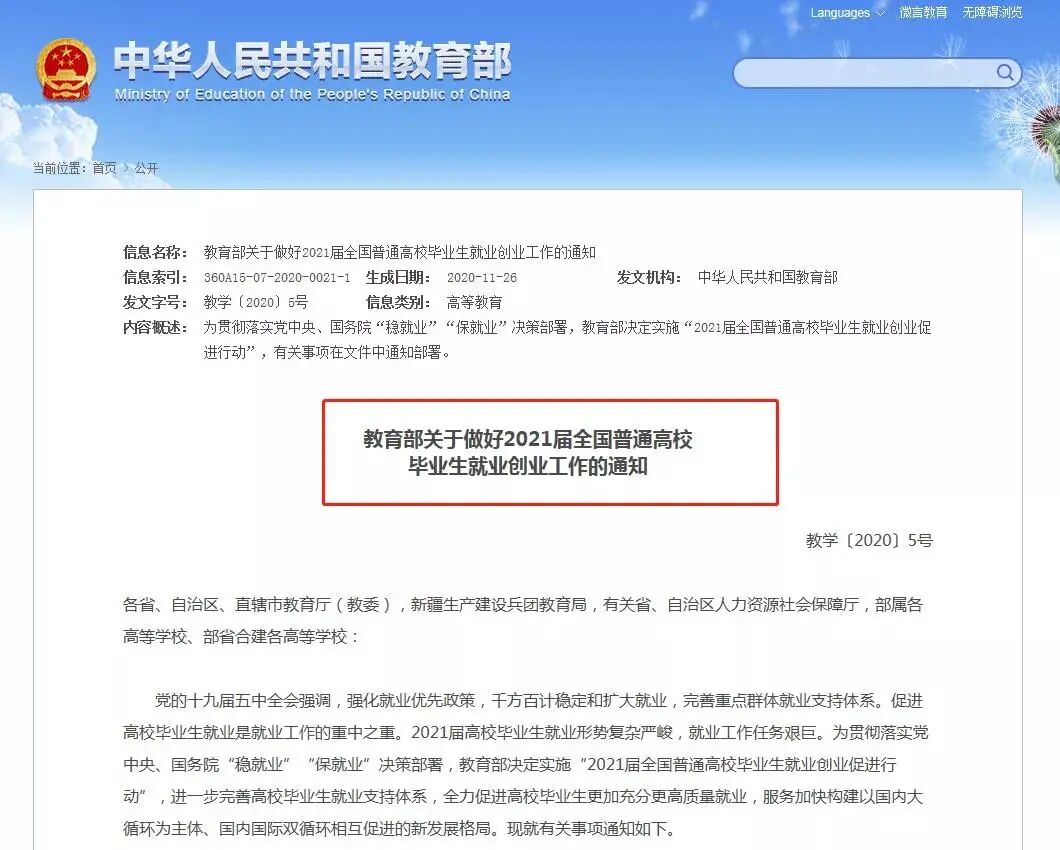 2020年,教育部发布关于做好2021届全国普通高校毕业生就业创业工作的通知。通知指出,树立正确用人导向。推动党政机关、事业单位、国有企业带头扭转“唯名校”“唯学历”的用人导向,在招聘公告和实际操作中不得将毕业院校、国(境)外学习经历、学习方式(全日制和非全日制)作为限制性条件。